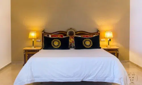 Inside, eight Versace-themed bedrooms with en-suite bathrooms provide accommodation for up to 16+ guests. Each room is designed with luxury and comfort in mind, featuring hot tubs, baths, and walk-in showers. Bright, spacious interiors are paired with modern amenities such as air-conditioning, satellite TV, and a fully equipped kitchen, ensuring a stylish yet comfortable stay.